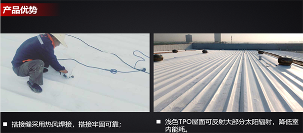 2.6、TPO維修專用 產(chǎn)品執(zhí)行標(biāo)準(zhǔn)--GB 18173.1-2012 卷材長(zhǎng)20米寬2米;搭接邊10公分;厚度0.8+覆布;重量:0.8KG/㎡ 輔料:水泥基面用水泥粘結(jié)膠料和鋼屋面用氯丁膠、固定用壓條、鋼釘。