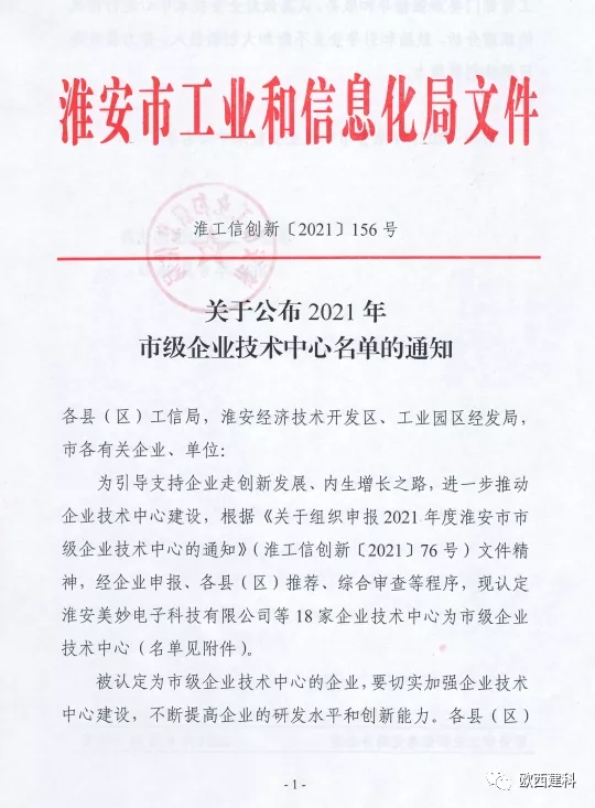 近日,淮安市工業(yè)與信息化局為我公司頒發(fā)了《淮安市市級企業(yè)技術(shù)中心》認(rèn)定。這是我公司繼獲得《國家高新技術(shù)企業(yè)》、《江蘇省科技型中小企業(yè)》、《江蘇省民營科技型企業(yè)》等多項(xiàng)榮譽(yù)后,獲得的又一重要權(quán)威性認(rèn)證。