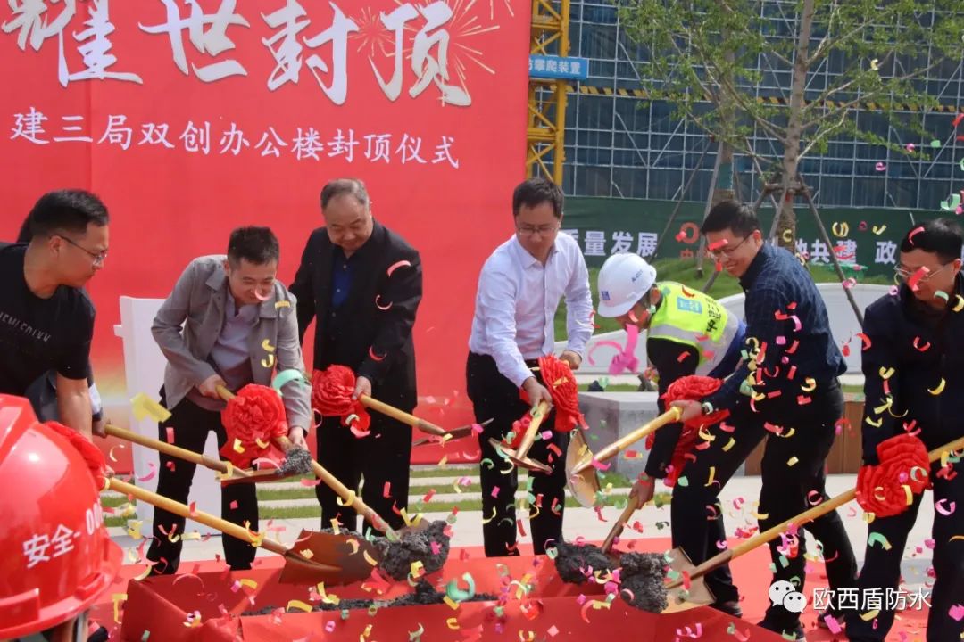 4月27日,由江蘇歐西盾防水工程技術有限公司參建的中電光谷洪澤生態(tài)經濟示范園雙創(chuàng)辦公樓順利封頂,公司領導及相關項目施工負責人參加了此次封頂典禮。