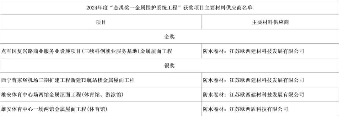 在2024年度建筑防水行業(yè)的重磅評選——“建筑防水行業(yè)科學技術獎—工程技術獎(金禹獎—金屬圍護系統(tǒng)工程)”中,歐西盾防水卷材成功入選獲獎項目主要材料供應商名單。該獎項由中國建筑防水協(xié)會與《中國建筑防水》雜志社聯(lián)合評定,是全國金屬圍護系統(tǒng)行業(yè)優(yōu)秀工程項目的至高榮譽,每年評定一次,旨在表彰行業(yè)內(nèi)最頂尖的工程項目與材料供應商。此次榮獲獎的四個項目,無一不是行業(yè)內(nèi)的標桿性建筑,而它們背后都有著歐西盾防水卷材的堅實支撐。