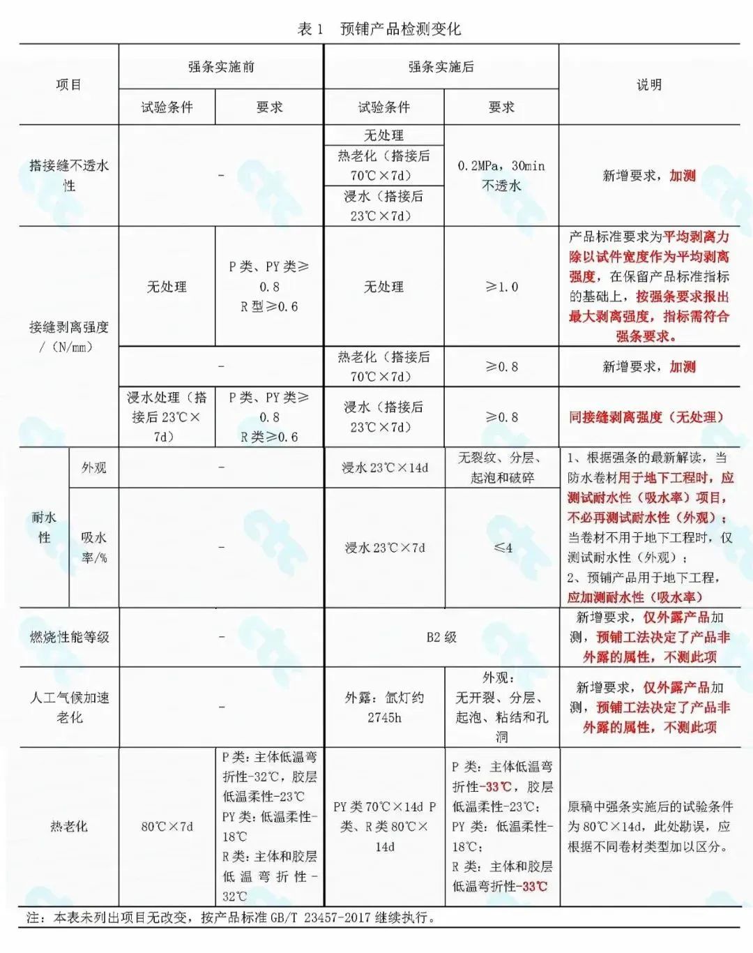 預鋪防水卷材(執行標準為GB/T 23457—2017《預鋪防水卷材》)。預鋪防水卷材施工完成后,在混凝土澆注前,會有一段暴露時間,因此產品標準規定了“與后澆混凝土剝離強度(紫外線處理)”,采用的也是氙弧燈老化試驗方法,但這與強條提出外露防水材料人工氣候加速老化試驗并無關聯。本質上,預鋪防水材料還是非外露材料,不涉及強條規定外露使用的相關要求。